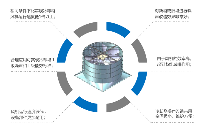 同軸雙風機 實現了:風機超低速運行輸出冷卻塔所需風量。顛覆了:傳統冷卻塔行業穿衣戴帽的降噪理念